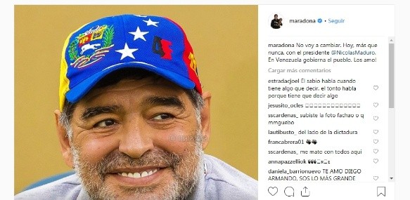 "No voy a cambiar. Hoy, más que nunca, con el presidente Nicolás Maduro. En Venezuela gobierna el pueblo. Los amo!", afirmó Maradona.
