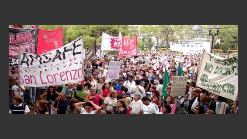 Según los dirigentes docentes, el paro que realizan este martes los maestros públicos y privados de la provincia es "contundente". Se trata de la primera medida de fuerza del sector, que pide aumento de sueldo, contra la gestión de Hermes Binner. La medida de fuerza se planteó con movilización incluida, desde la Plaza 25 de Mayo a la Plaza San Martín.