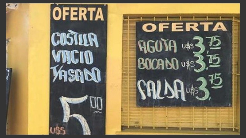 Costilla, vacío, tapa de asado: 5 dólares (200 pesos). Aguja, bocado y falda: 3,75 dólares (150 pesos)", se podía leer en el cartel del supermercado ubicado en la esquina de las calles Santa Ana y Angel Avalos, en barrio Alto Alberdi de la ciudad de Córdoba.