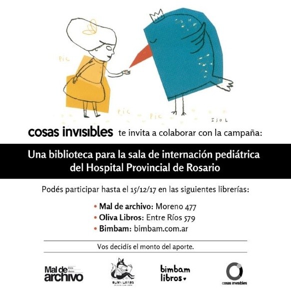 El grupo Cosas Invisibles prepara una biblioteca móvil para los niños del hospital Provincial y solicitan colaboración para hacerse de ejemplares. La estructura estará montada en rueditas para que los chicos que no puedan salir de la cama puedan disfrutar del escape de la lectura. Hay tiempo para colaborar hasta el 15 de diciembre.