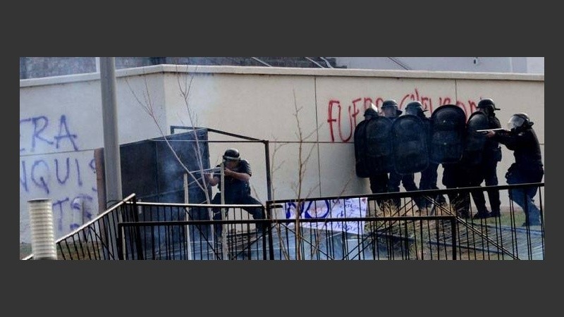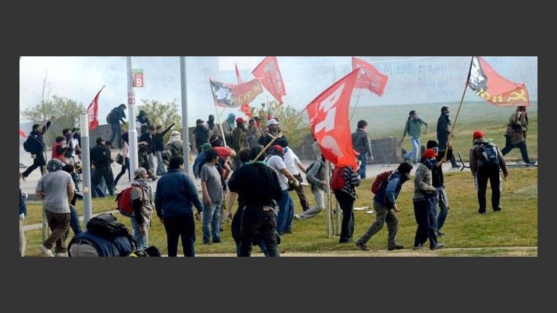 Según publicó el diario Río Negro, cerca del mediodía un grupo de manifestantes opuestos al convenio comenzó a derribar las vallas, por lo que la policía reaccionó con gases lacrimógenos que fueron respondidos a pedradas.