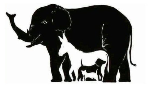 A primera vista, pueden distinguirse de manera clara cuatro figuras: un elefante, un burro, un gato y un perro.
