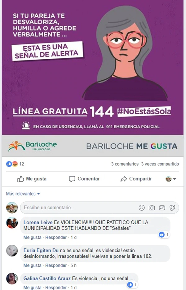 El sitio de noticias Infobae.com, publicó que el municipio de San Carlos de Bariloche lanzó una campaña de comunicación de concientización sobre la violencia de género en la Argentina. Pero tuvieron que dar marcha atrás porque en uno de los afiches calificaron como una simple "señal de alerta" a situaciones que implican claramente el ejercicio de la violencia de género.