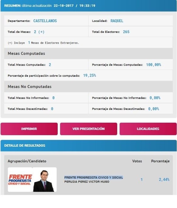 Luego de conocida la noticia, del entorno del presidente comunal de Colonia Raquel surgió que “se trataría de un error en la carga de datos”. Lo concreto es que, según la carga oficial, Perusia ganó con un voto en su pueblo.