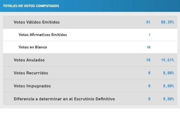 De acuerdo a los datos oficiales cargados el domingo a la noche, de los 265 electores, sólo 51 se acercaron a las urnas (19,25% del padrón). Del más de medio centenar de personas, 10 anularon su voto y 40 depositaron el sobre vacío. El único voto válido fue para Perusia Pérez, presumiblemente emitido por él mismo. ¿No lo votaron ni sus familiares?