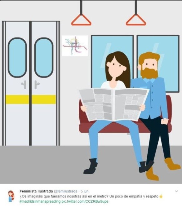 Mientras que la usuaria Feminista Ilustrada escribió en la misma red social: "¿Os imagináis que fuéramos nosotras así en el metro? Un poco de empatía y respeto". El mensaje iba acompañado de una ilustración que mostraba a una mujer con las piernas abiertas leyendo el periódico junto a un hombre con las piernas cruzadas e incómodo.