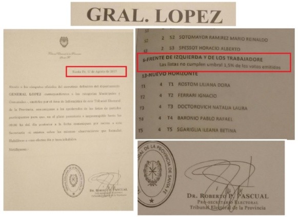 “Cuando nos entregaron los documentos de los resultados de los primeros departamentos, se nos derivó a los apoderados al sector de cómputos donde la jefa del sector nos explicó cómo se confeccionaron dichos informes y volvió a ratificar que el único piso proscriptivo utilizado era el 1,5% de los votos válidos”, añadió el referente. Un ejemplo es la carpeta correspondiente al Departamento General López con fecha del jueves 17 y firma de Pascual.
