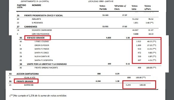 En un PDF del organismo sobre los resultados para concejal en ciudad de Santa Fe, que no llegó a ser oficializado pero que circuló entre las fuerzas, se puede ver cómo ninguna lista del partido Espacio Grande logra pasar el umbral acordado y tienen el doble asterisco que significa: “No cumple el 1,5% de la suma de votos emitidos”.