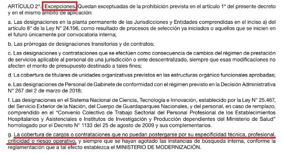 Esa normativa que entró en vigencia el 10 de julio define “excepciones” en su artículo 2 y habilita cubrir cargos “que no puedan postergarse por su especificidad técnica, profesional, criticidad o riesgo operativo”.