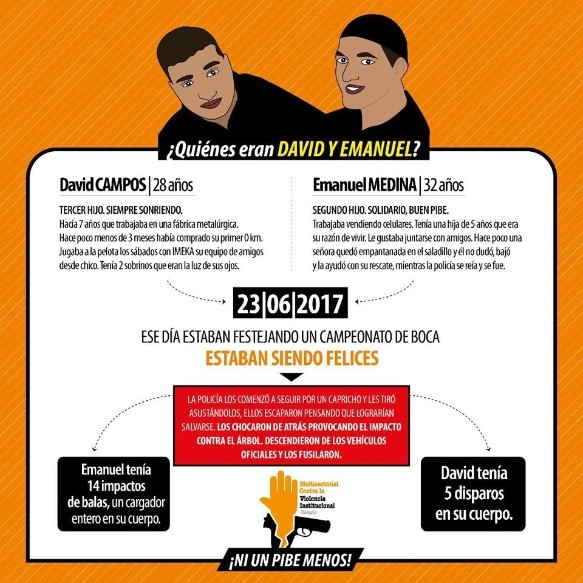 Desde ese espacio, recordaron que el pasado viernes 23 de junio los jóvenes fueron "asesinados por funcionarios policiales del Comando Radioeléctrico y de la Policía de Acción Táctica". "David y Emanuel habían salido a bailar y divertirse y cerca de las 11, mientras viajaban en el auto de uno de ellos, comenzaron a ser perseguidos por una unidad móvil de Policía motorizada. Los motivos que dieron inicio a dicha persecución se desconocen", dice el texto.