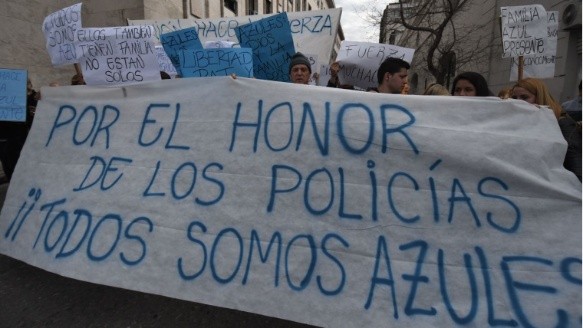 “Por el honor de los policías, todos somos azules”. “Policía vocación salvar vidas”. “Azules firmes y dignos”. “La policía nos cuida”. Tales eran las consignas que este martes al mediodía los familiares de los 16 policías detenidos por la persecución fatal levantaron frente a Tribunales.