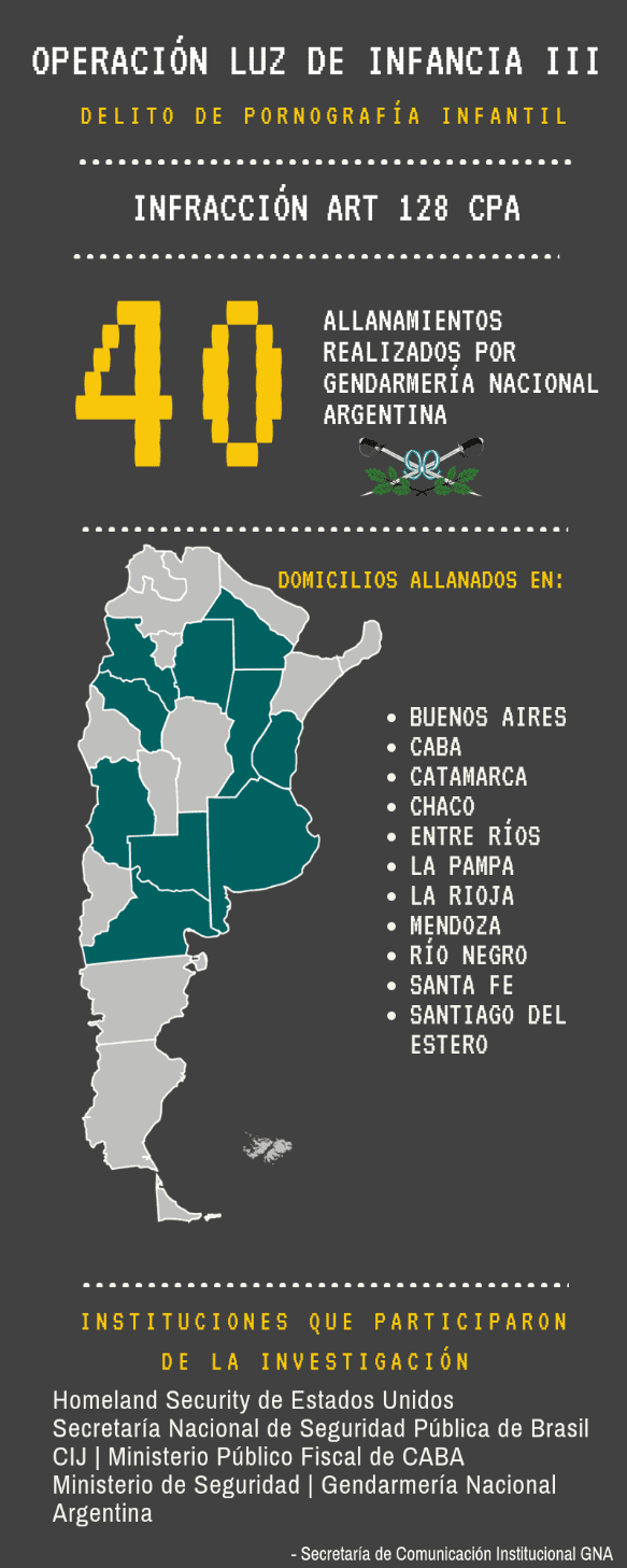Este caso internacional de cibercrimen es denominado “Luz de Infancia III”. Según fuentes oficiales, se secuestraron elementos electrónicos e informáticos en inmuebles de Catamarca, Chaco, Entre Ríos, La Pampa, Mendoza, Río Negro, Santa Fe, Santiago del Estero, La Rioja, Ciudad Autónoma de Buenos Aires (CABA) y y provincia de Buenos Aires.