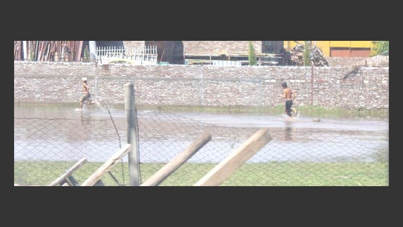 Pero siempre están aquellos que encuentran una vía de escape al mal momento, un espacio para el juego, como los dos pibes de la foto que por Camino Límite del Municipio de zona oeste, entre Rivarola y Perón, armaron una suerte de picadito imaginario sobre una canchita de fútbol inundada.