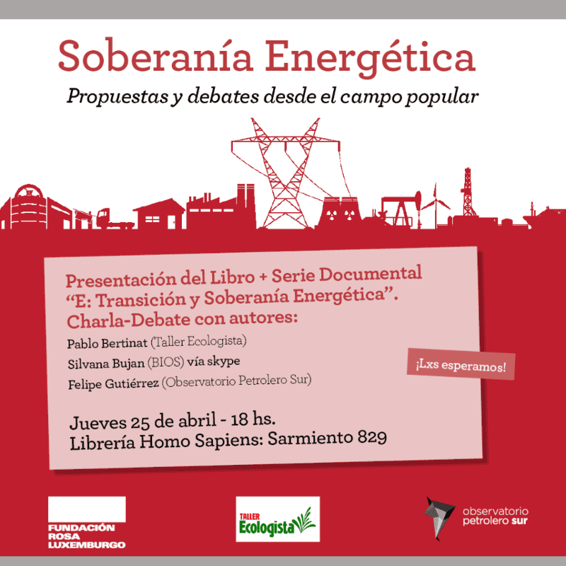 El Taller Ecologista y el Opsur (Observatorio Petrolero Sur) invitan a la presentación del libro "Soberanía energética. Propuestas y debates desde el campo popular", que contará con una charla debate con los autores y la proyección de la serie documental “E: Transición y Soberanía Energética”.