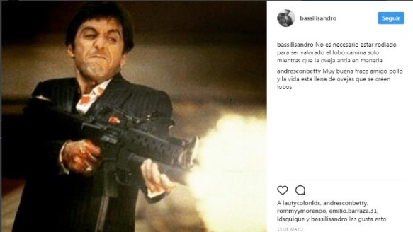 Se trata del mítico Tony Montana, el personaje de ficción y el protagonista de Scarface que encarnó Al Pacino, con un mensaje: “No es necesario estar rodiado (sic) para ser valorado el lobo camina solo mientras que la oveja anda en manada”.