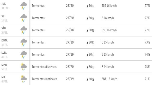 The Weather Channel prevé 14 días de tiempo inestable con tormentas frecuentes interrumpidas por breves intervalos de nubes y algo de sol durante los días 25, 28 y 29 de enero próximos, algo que, según describe el director del Grupo Caza Tormentas del Sur, Oscar Monjelat, “acompañará toda la temporada estival, como consecuencia del denominado Fenómeno de «El Niño» que afecta nuestra región”.