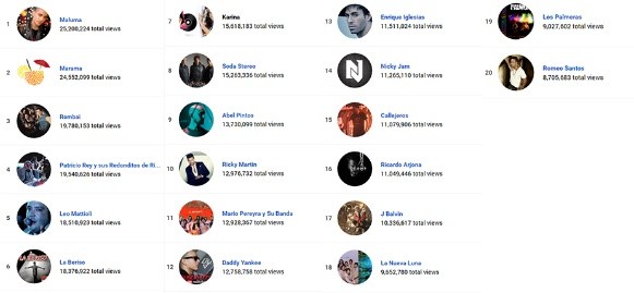 En primer lugar se encuentra el colombiano Juan Luis Londoño Arias, mejor conocido como Maluma; le siguen los uruguayos de Marama y Rombai con su exitosa "cumbia cheta"; pegaditos aparecen la vigencia de Patricio Rey y sus Redonditos de Ricota y Leo Mattioli, A.K.A El león santafesino.