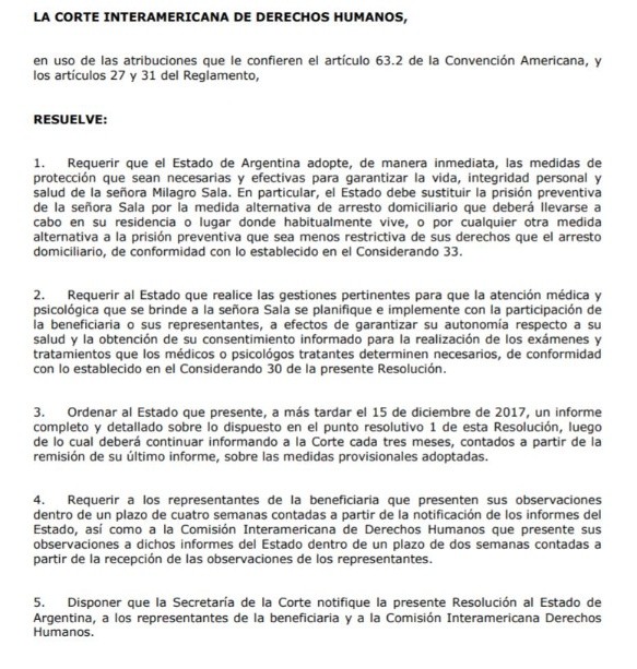 En el tramo resolutivo de esa medida provisional, la Corte IDH requirió "que el Estado de Argentina adopte, de manera inmediata, las medidas de protección que sean necesarias y efectivas para garantizar la vida, integridad personal y salud de la señora Milagro Sala".