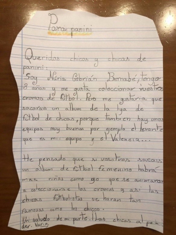 La nena escribió: "Soy Núria Cebrián Bernabé, tengo 8 años y me gusta coleccionar vuestros cromos de fútbol. Pero me gustaría que sacarais un álbum de la liga de fútbol de chicas, porque también hay unos equipos muy buenos por ejemplo el Levante que es mi equipo y el Valencia… He pensado que si vosotros sacais un álbum de fútbol femenino habrá más niñas como yo que se animarán a coleccionar las figuritas y así las chicas futbolistas se harán tan famosas como los chicos".