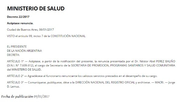 "Acéptase, a partir de la notificación del presente, la renuncia presentada por el Dr. Néstor Abel Pérez Baliño al cargo de secretario de la Secretaría de Promoción, Programas Sanitarios y Salud Comunitaria del Ministerio de Salud", dispone el artículo 1° de la resolución.
