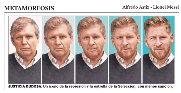 Este sábado, los lectores de Perfil quedaron impactados al observar una foto de la sección “Metamorfosis” del diario. Allí se ve cómo el rostro del asesino Alfredo Astiz se convierte al cabo de cinco fotos se transforma en el de Lionel Messi.