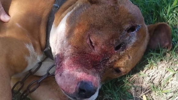 Un perro de raza pitbull fue encontrado atado con cadenas en un descampado de la zona oeste y con dos puntadas en la cabeza que estaban infectadas.