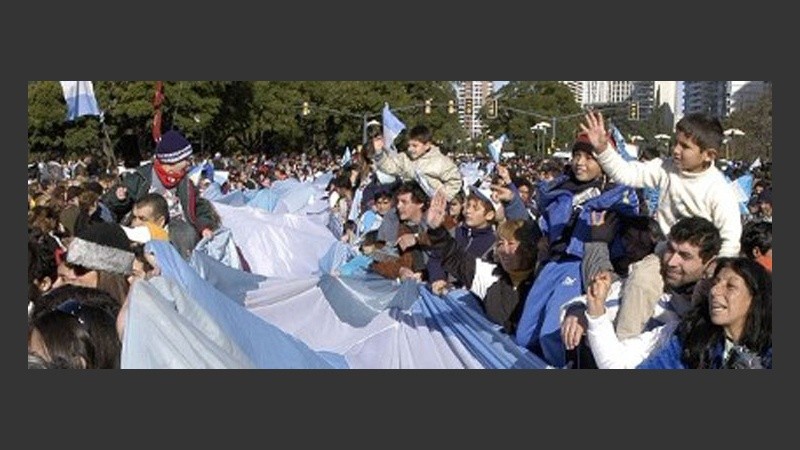 La fiesta histórica. La de siempre, la que siempre identificó a la ciudad. Rosario celebra hoy el Día de la Bandera a toda orquesta, por más que falten el presidente Néstor Kirchner y el gobernador Jorge Obeid, que viajaron a España para una visita oficial. El tradicional ararancó luego de la llegada del vicepresidente Daniel Scioli, quien dijo que hay que tener presente siempre el ejemplo de Belgrano y que estaba orgulloso de estar en Rosario, todo un símbolo de la recupración económica del país. Junto a Scioli llegó la ministra de Defensa, Nilda Garré, quien volvió a criticar a los militares que reivindican el terrorismo de Estado (ver nota relacionada). El desfile cívico militar tuvo algo menos de gente que el año pasado. Pero hubo gran entusiasmo, sobre todo cuando comenzó a pasar de mano en mano la bandera más larga del mundo, la de Alta en el Cielo, que ya llega a los 11 kilómetros de longitud. Pero el homenaje a la bandera no se centra sólo en el Monumento. Sobre todo cuando, por estos días, la combinación de la fecha histórica con el Mundial de Fútbol ha hecho que, como nunca antes, Rosario esté cubierta de paños celestes y blancos en toda su geografía.