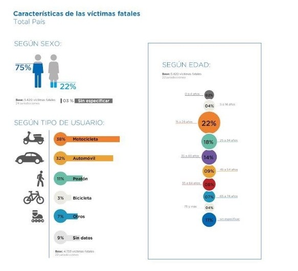 La mayor parte de las víctimas fatales por accidentes de tránsito en 2017 en el país fueron motociclistas -un 38 por ciento del total-, seguidos por conductores de auto -32 por ciento-, peatones -11 por ciento- y ciclistas -3 por ciento-, detallaron, y precisaron que "el resto no se clasificó".