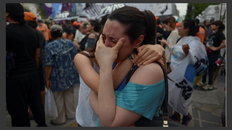 Fuera del hotel el clima era de profunda tristeza. Muchos se abrazaban entre lágrimas y otros desfilaban camino a Plaza de Mayo para reunirse con las distintas agrupaciones que desde hacía unas horas se agolpaba frente a la Rosada.