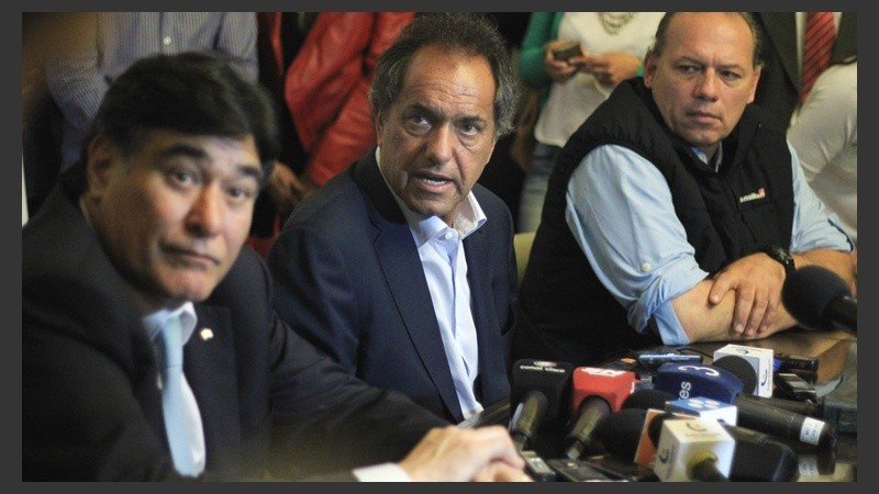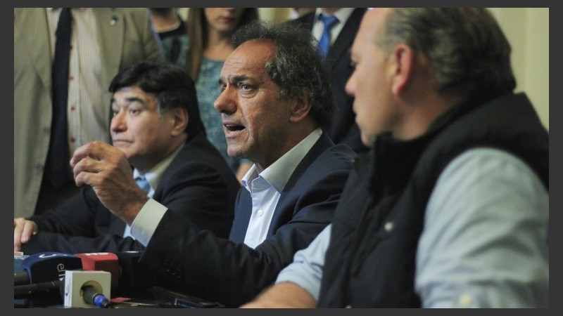 El candidato presidencial del Frente para la Victoria, Daniel Scioli, se reunió este miércoles con la intendenta Mónica Fein para presentar sus propuestas para Rosario. El encuentro en el Palacio de los Leones se desarrolló en la misma sala donde por la mañana estuvo la postulante a la vicepresidencia de Cambiemos, Gabriela Michetti. El gobernador bonaerense estuvo junto a su compañero de fórmula, Carlos Zannini, y al secretario de Seguridad de la Nación, Sergio Berni.