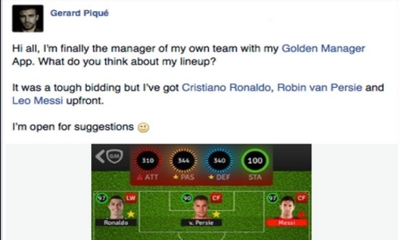El zaguero español publicó en su cuenta oficial de Facebook el que sería su 11 ideal, jugando con un 3-4-3. En el arco Iker Casillas; Dani Alvés, Gerard Piqué y Alba en la línea defensiva.