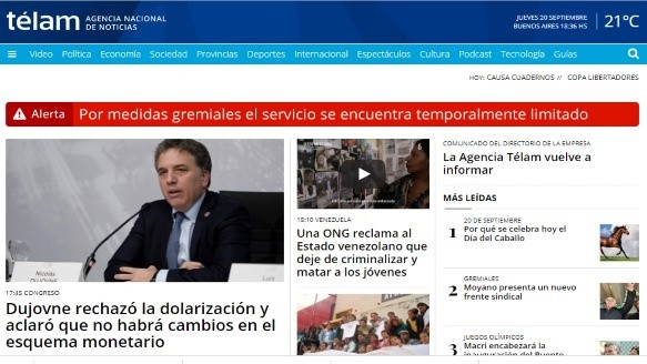 “Después de dos meses y medio de negociaciones frustradas por la intransigencia patronal, los funcionarios resolvieron ayer poner al aire un portal clandestino, que opera desde las instalaciones del predio de Tecnópolis, donde, escondidos y lejos de la realidad, un puñado de jefes periodísticos producen una réplica trucha del potente servicio de noticias público. Para muestra basta un botón: lejos del funcionamiento de una agencia de noticias, el portal amateur de Pousá y Carpena solo funciona entre las 10 y las 18, dañando el prestigio de nuestra agencia”.