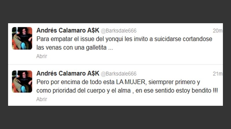 Lejos de la creatividad musical que supo tener, el artista aprovecha los pocos caracteres que brinda la red social para escribir de manera abstracta y controvertida. Un supuesto asesinato en España generó la polémica y usuarios de todo el mundo comenzaron a tomar parte y tanto críticos como seguidores del músico desataron una batalla en la red, en la que el propio Calamaro no quiso quedar afuera.