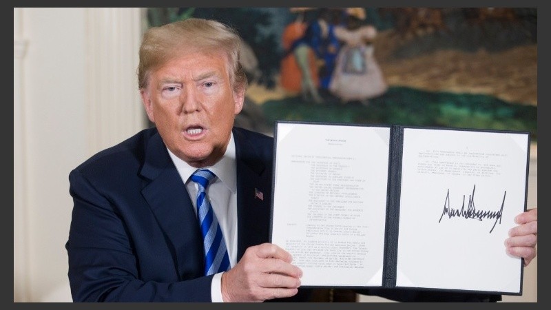 Trump firmó una declaración que, en sus palabras, "empieza a reanudar las sanciones nucleares de Estados Unidos al régimen iraní", aunque, según precisó el Departamento del Tesoro, algunas de ellas no entrarán en vigor hasta que transcurran periodos de entre 90 y 180 días.