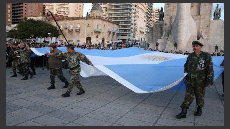 La bandera que se izó fue llevada por ex combatientes de Malvinas. Y se realizó además la tradicional jura, por parte de los cadetes del Instituto Aeronáutico Militar de Funes y la Escuela de Policía.