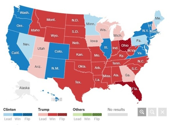 La tendencia que comenzó favorable a la demócrata el martes cambió minuto a minuto y, ya al inicio de este miércoles, el triunfo del republicano pasó de improbable a muy posible. Además, lograba mayoría en ambas cámaras legislativas, lo que le daba aún mayor poder del que tuvo Obama en sus gestiones.