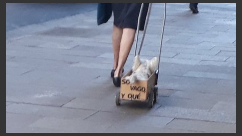 Un pequeño perro que es paseado en un carrito despierta la atención por el centro de Rosario. Y no sólo por el medio de locomoción, extraño de por sí, sino por una leyenda que éste lleva en la parte trasera: “Soy vago y qué”.