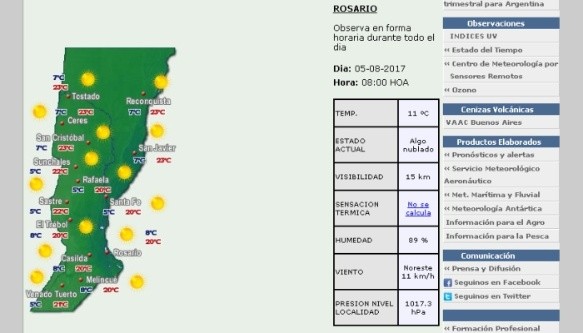 El Servicio Meteorológico Nacional (SMN), en su sitio oficial, llenó el mapita de la provincia de Santa Fe con hermosos, despejados y redondos soles. Así informa que estará el tiempo este fin de semana, con cielos mayormente despejados y temperaturas máximas por arriba de los 20 grados.