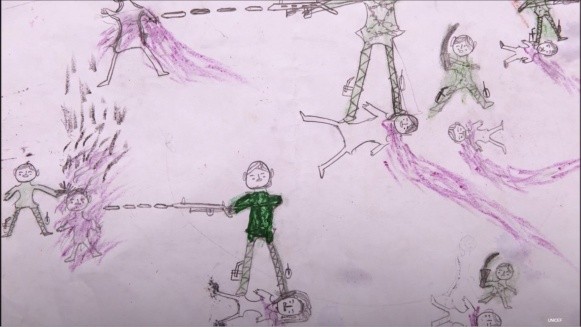 Al llegar al campo de refugiados, Monzur dibujaba lo que había sucedido en su pueblo, y nos cuenta lo que tuvo que vivir: “Mis hermanas estaban jugando con sus amigos cuando llegaron los militares y las mataron. Recién ahora estoy empezando a olvidar cómo nos golpearon y mataron a tanta gente”.