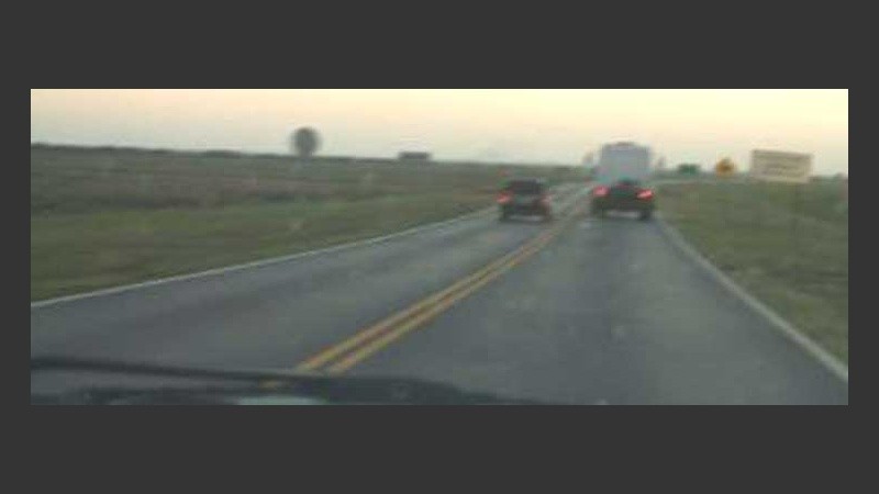 "Volvíamos de Victoria y la gente no respetaba nada en la ruta", cuenta. Las imágenes, tomadas el domingo de Pascua, muestran cómo dos autos diferentes y en distintos momentos se apuran por pasar a otros sin respetar la doble línea amarilla que prohibe precisamente esa maniobra.