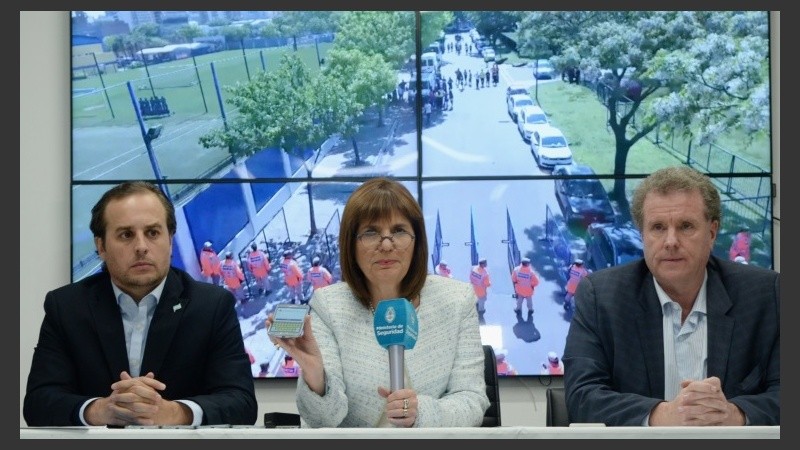 “Viajarán policías con teléfonos especiales que contienen estos listados con la foto, DNI y el pasaporte de cada persona que tiene un impedimento para ingresar a las canchas”, contó la ministra durante el lanzamiento.