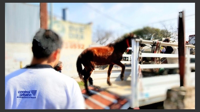 Dos caballos fueron retirados de la vía pública este jueves, en un procedimiento realizado por personal de Control Urbano. Los animales fueron llevados a los corrales para equinos que tiene la Municipalidad de Rosario debido que transportaban una excesiva cantidad de chatarra.