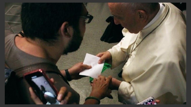 Este miércoles, Nicolás Fuster, un estudiante argentino que hace 5 años que vive en Roma, le entregó un pañuelo verde a Francisco en el Vaticano junto con una carta en la que le explica por qué apoya el proyecto de interrupción voluntaria del embarazo. El proyecto cuenta con la media sanción de la Cámara de Diputados y la semana que viene se votaría en el Senado, aunque todavía no obtuvo dictamen de comisiones.
