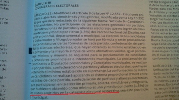 En la primera parte de la reforma del artículo 9 de la norma anterior, el texto habla del 1,5 por ciento del padrón electoral por distrito como piso para todos los partidos. Más adelante, dice: “La proclamación de candidatos a diputados provinciales y concejales se realizará por partido que haya obtenido el mínimo establecido en el presente (el 1,5 del padrón). La conformación de la lista de candidatos se realizará aplicando el sistema proporcional D´Hont entre las listas de cada partido que participen en la elección primaria que hubieren obtenido como mínimo el 1,5 por ciento de los votos emitidos en la categoría electoral respectiva, provincial o municipal”.