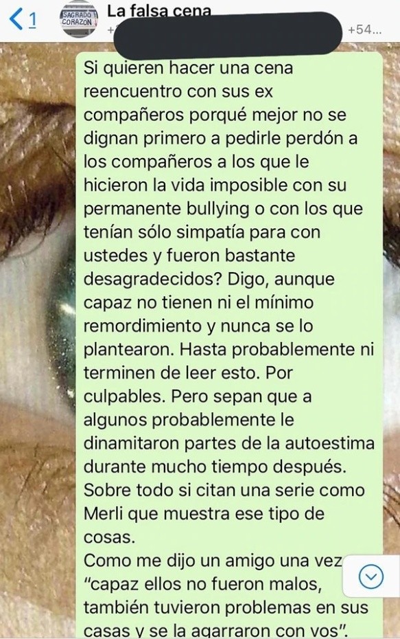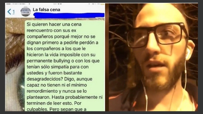Seis años después de terminar la secundaria, Agustín pudo decirle lo que sentía a esos ex compañeros agresivos vía Whatsapp. Recibió un mensaje en su celular y lo agregaron a un grupo “Falsa cena” para invitarlo a participar de un reencuentro.
