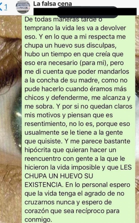 El joven que vive en La Plata respondió con un largo mensaje y reclamó: “¿Por qué mejor no se dignan primero a pedirle perdón a los compañeros a los que le hicieron la vida imposible con su permanente bullying?". El autor del texto lo compartió sus redes: