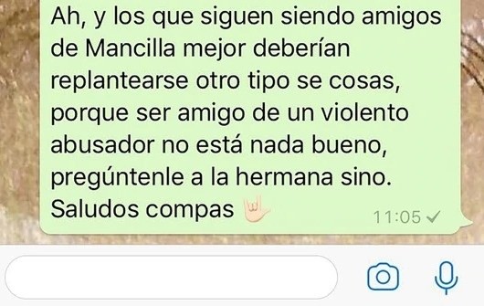 Agustín dejó un mensaje especial para "los amigos de Mancilla” a quien calificó de “violento abusador”. “Pregúntenle a la hermana sino. Saludos compas", fue el cierre de su descargo en el grupo pero el inicio de una intensa repercusión en las redes sociales.