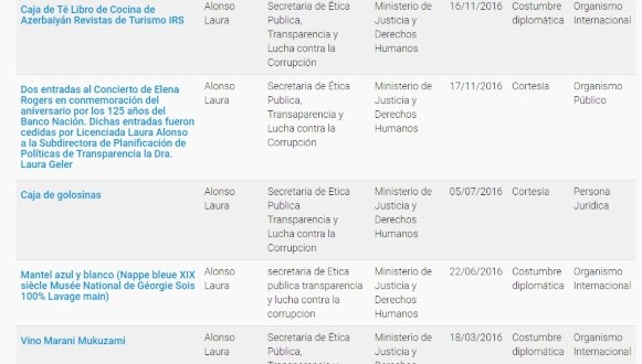 La Oficina Anticorrupción (OA) difundió la lista de obsequios a funcionarios públicos y los viajes financiados por terceros, que cuenta con un registro online disponible para los ciudadanos desde el mes pasado.