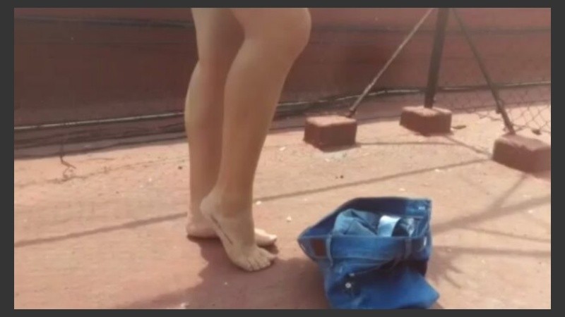En casi dos minutos, la joven muestra cómo mueve sus piernas para elevar los pantalones entre sus piernas. Finalmente, logró ponérselos.