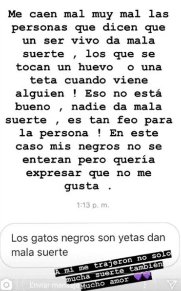 Todo comenzó cuando Natalie compartió una historia jugando con los michinos. Entonces, recibió el mensaje que decía que "los gatos negros son yeta, dan mala suerte".